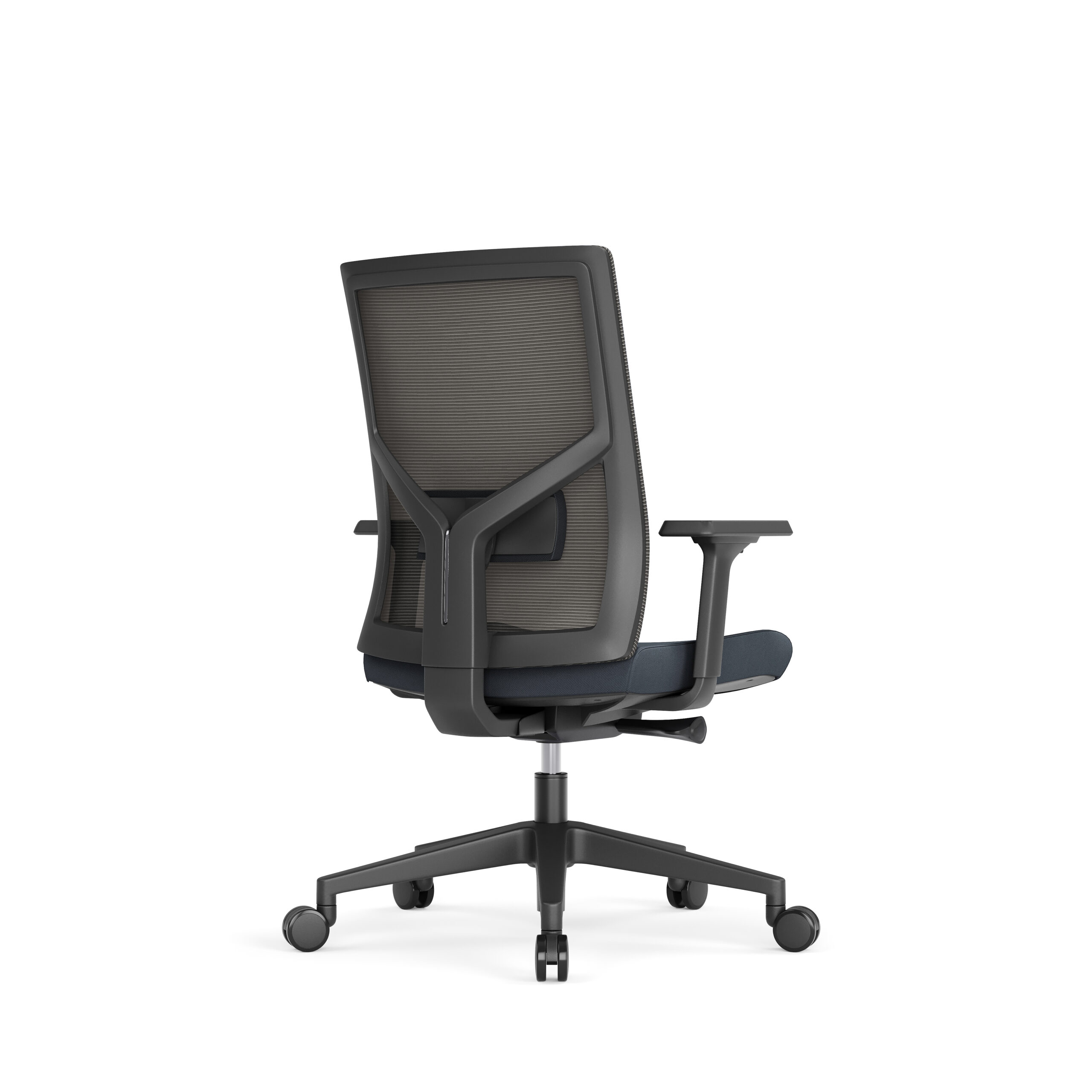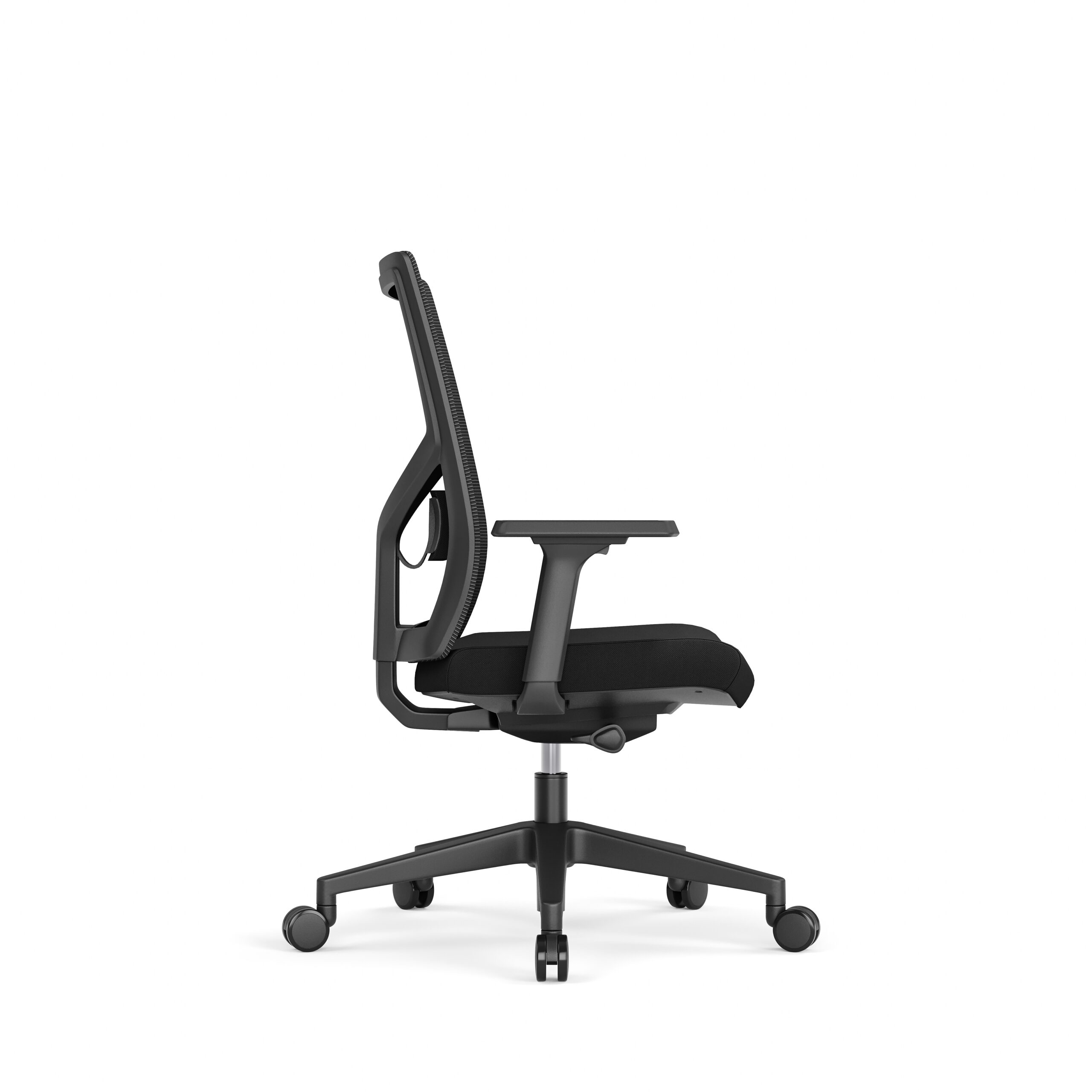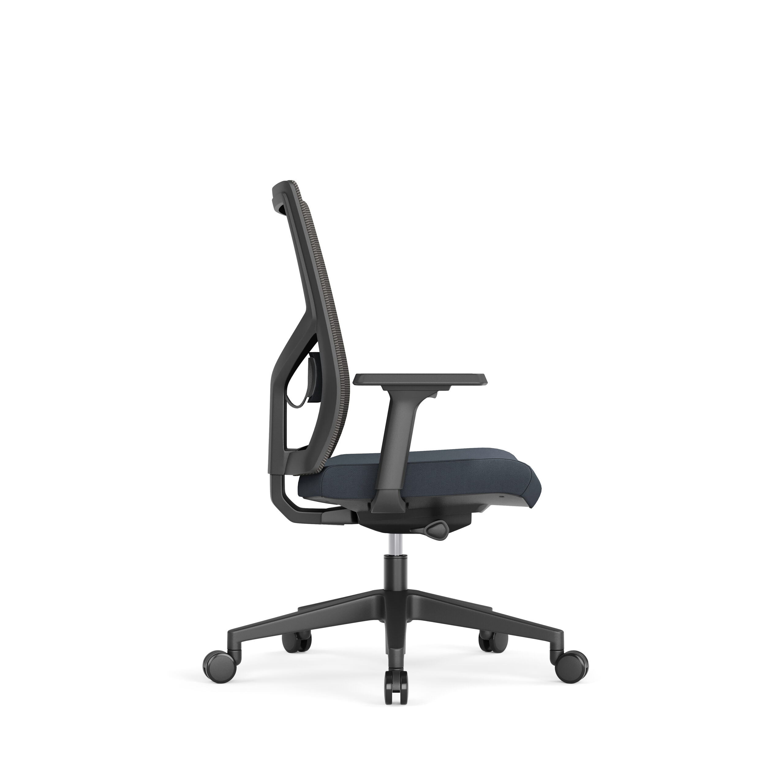 De kantelbare zitting en 1D-armleuningen zorgen voor extra comfort, terwijl het duurzame frame van gerecycled materiaal een stevige basis vormt.