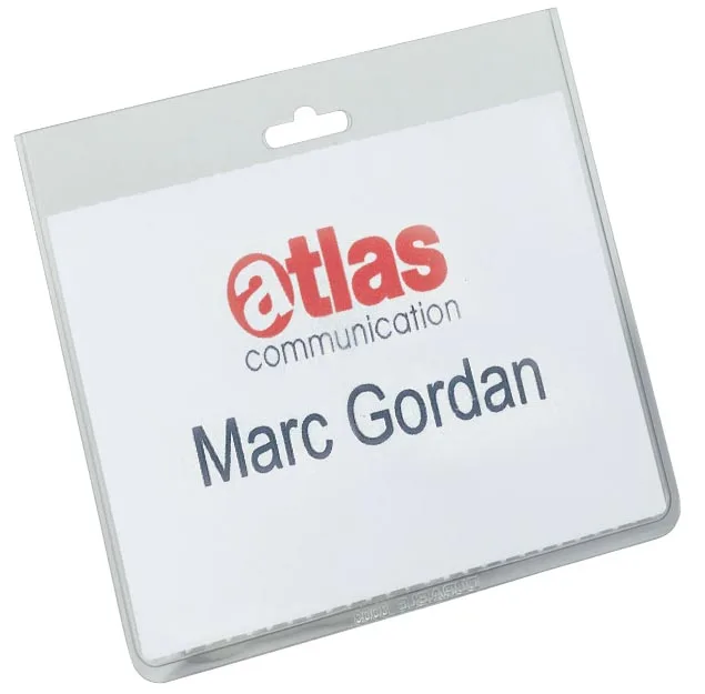 Ft 60 x 90 mm. Badge van hoog transparante harde folie met blanco insteekkaartje. Door een uitsparing is de bevestiging met pasclip of textielband mogelijk.