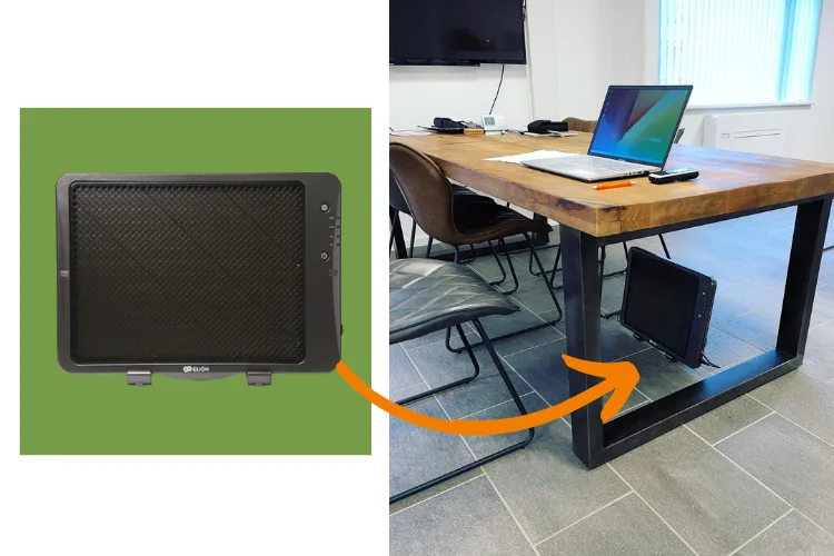 Koude benen en voeten op jouw werkplek? Of onder jouw eettafel? Bij de receptiebalie? Dan is de ELION infrarood werkplekverwarmer dé oplossing voor jou. De Elion past onder vrijwel ieder bureau, receptiebalie of tafel. Met de bijgeleverde voetsteuntjes kan de Elion werkplekverwarming staand worden gebruikt, maar middels de montageplaat ook aan de onderzijde van het blad of aan de wand worden gemonteerd. Leaflet Elion werkplekverwarmer.