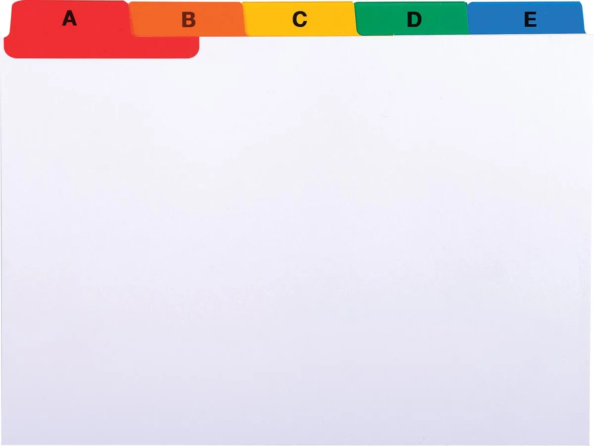 Tabbladen voor steekkaartenbak, bedrukt met alfabet in wit karton 160g, 25 tabs. Ideaal om steekkaarten alfabetisch te klasseren in een box van hetzelfde formaat. Deze FSC gecertificeerde witte tabbladen hebben versterkte, geplastificeerde tabs voor meer stevigheid en een langere levensduur. De gekleurde tabs vereenvoudigen de classificatie. 25 tabs, 5 sets van 5, van A tot Z voor een perfecte rangschikking.