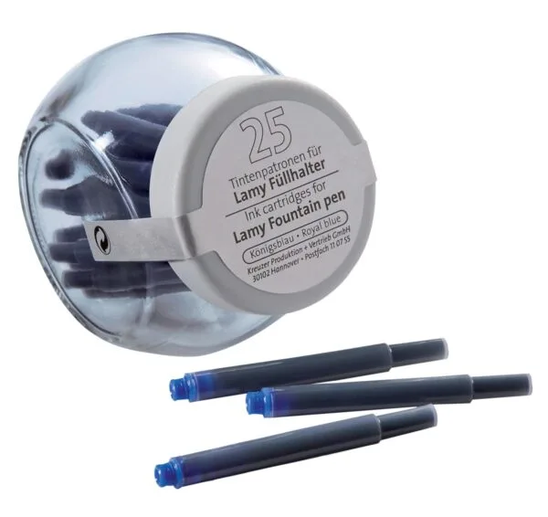 Dubbel formaat. Kleur: koningsblauw. Geschikt voor Lamy vulpennen. Glazen pot met 25 stuks.