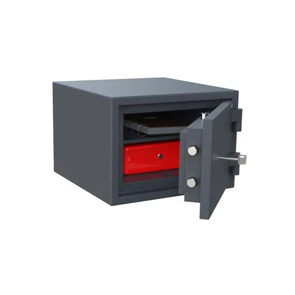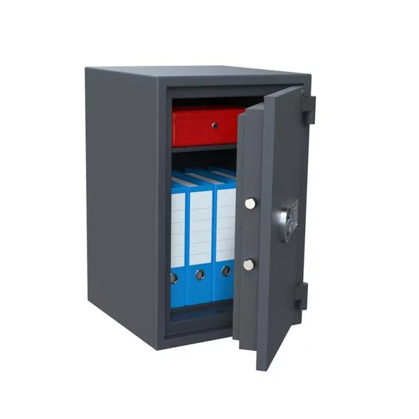 Intern biedt de kluis veelzijdigheid met in hoogte verstelbare legborden, waardoor verschillende eigendommen gemakkelijk kunnen worden opgeslagen. De kluis is uitgerust met een gecertificeerd dubbelbaard klavierslot met 2 sleutels voor extra beveiliging.