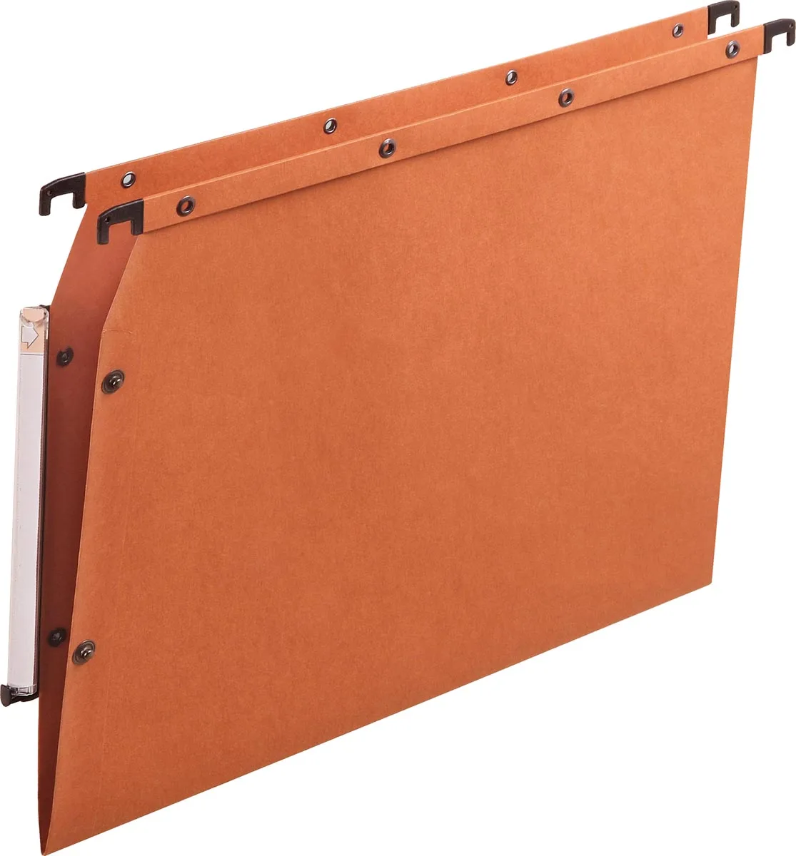 Voor ft A4. Uit stevig karton van 240 g/m², pH-neutraal (ISO 9706). Uniek: de hangmap is bevestigd met klinknagels aan de hangstrip. Platte metalen hangstrip met grote draagkracht. Tussenafstand: 330 mm. Kleur: oranje. Certificaat Blaue Engel.