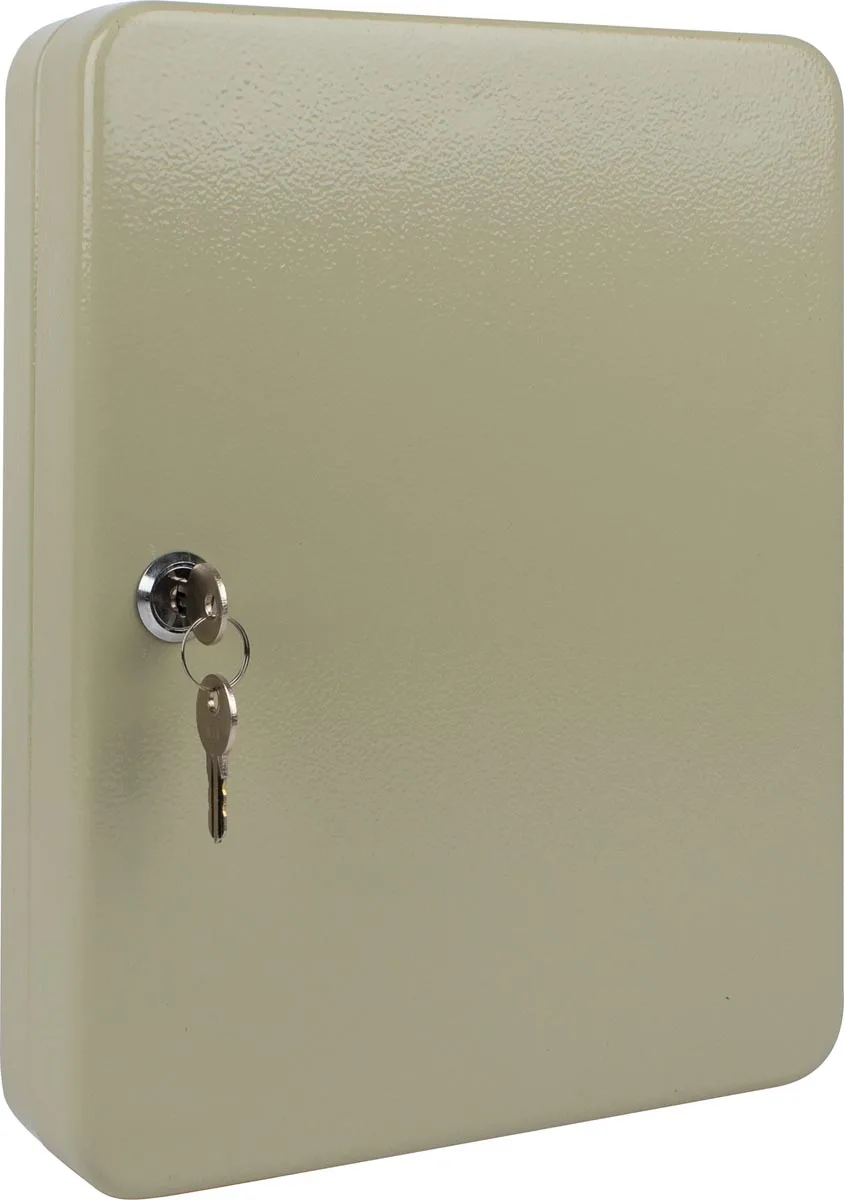 Uit plaatstaal. Met genummerde haakje. Met cilinderslot en 2 sleutels. Geleverd met wandbevestingsmateriaal. Kleur: grijs.