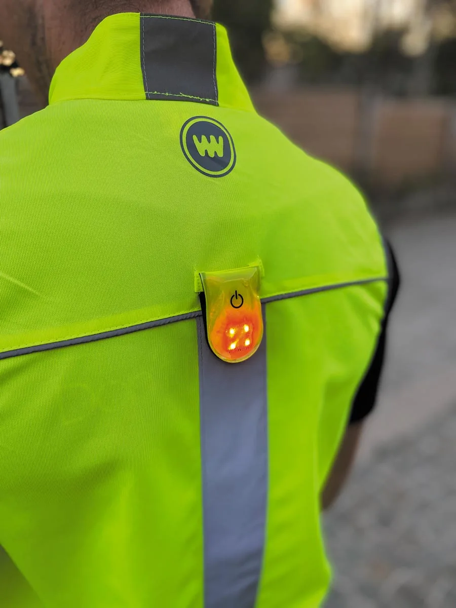 Reflecterend 3M materiaal in geel. 4 sterke rode leds. Spatwaterdicht. Overal aan te bevestigen d.m.v. magneten. Vervangbare batterij (CR2032 of CR2016).